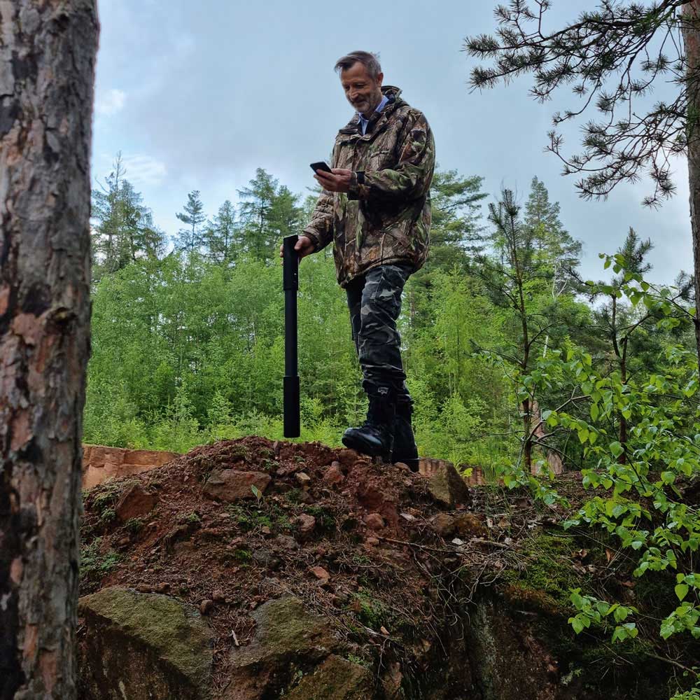 With the operating mode Magnetometer, anomalies in the magnetic field are immediately visualized on the smartphone display. In this way, potential finds like artifacts, treasure chests, old ammunition and further ferrous objects can be detected very easily. Experienced treasure hunters use the Magnetometer before scanning the target area with 3D Ground Scan in order to clear the scan field of smaller objects close to the surface.